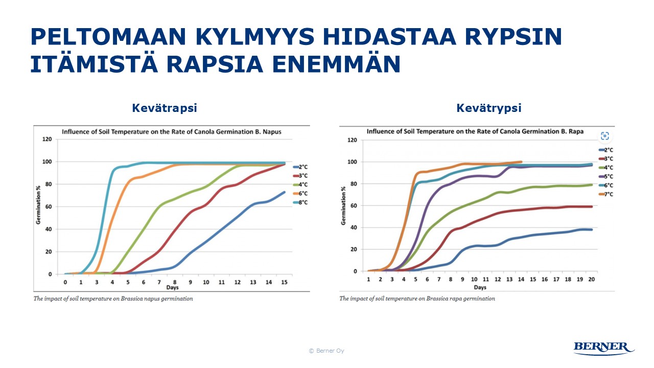 Pienikin ero maan lämpötilassa voi vaikuttaa merkittävästi siihen, kuinka nopeasti siemenet lähtevät itämään ja kuinka suuri osa itämiskykyisistä siemenistä lopulta itää. Kanadalaisten julkaisujen mukaan rapsilla yli 80 % siemenistä itää jo viidessä päivässä, jos maan lämpötila on yli 5°C keskimääräisiin lukemiin. Jos lämpötila on alhaisempi saman 80 % itävyyden saavuttaminen vaatii kaksinkertaisen ajan. Rypsillä ero on vieläkin dramaattisempi, sillä 5°C lämpötilassa 80 % tason saavuttaminen kestää noin viikon, mutta tätä alhaisemmissa lämpötiloissa samaan itävyystasoon pääsy vaatii reilusti yli kaksi viikkoa.